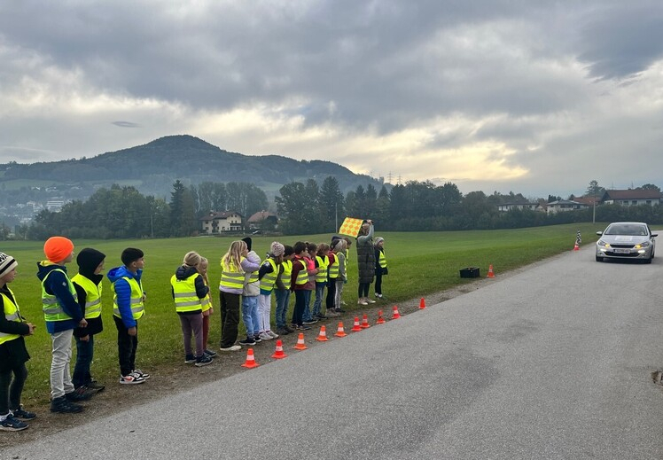 Nachdem die Kinder zuerst in der Klasse und dann draußen auf der Straße über den Anhalteweg gelernt haben, durften sie selbst ein Auto mit 30 km/h zum Stillstand bringen. Das hat wirklich Spaß gemacht.